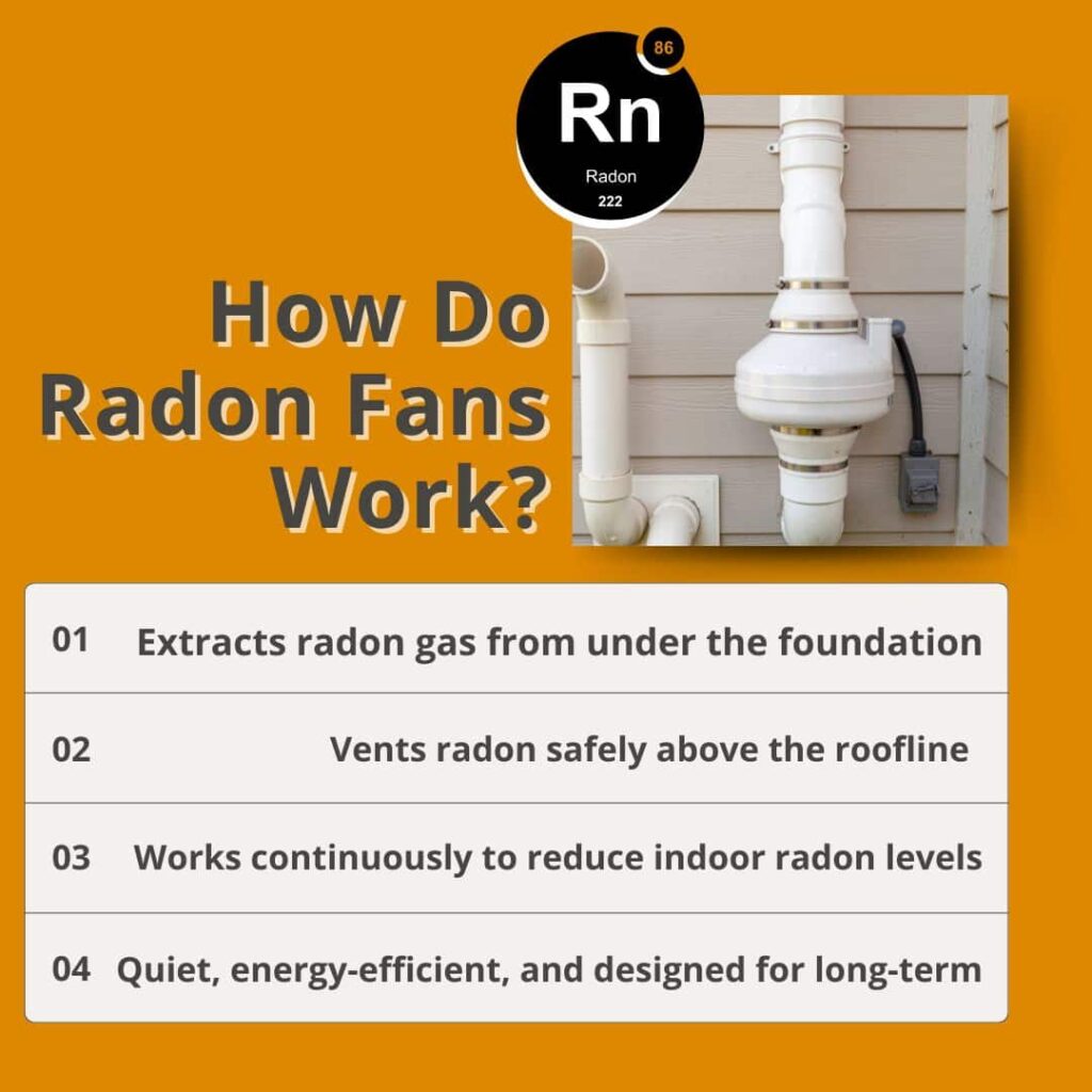 Radon fans work by creating negative pressure beneath your home’s foundation. This pressure pulls radon gas from the soil into a system of pipes connected to the fan.